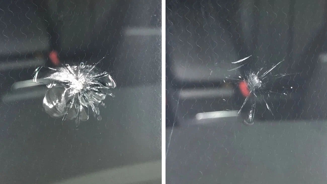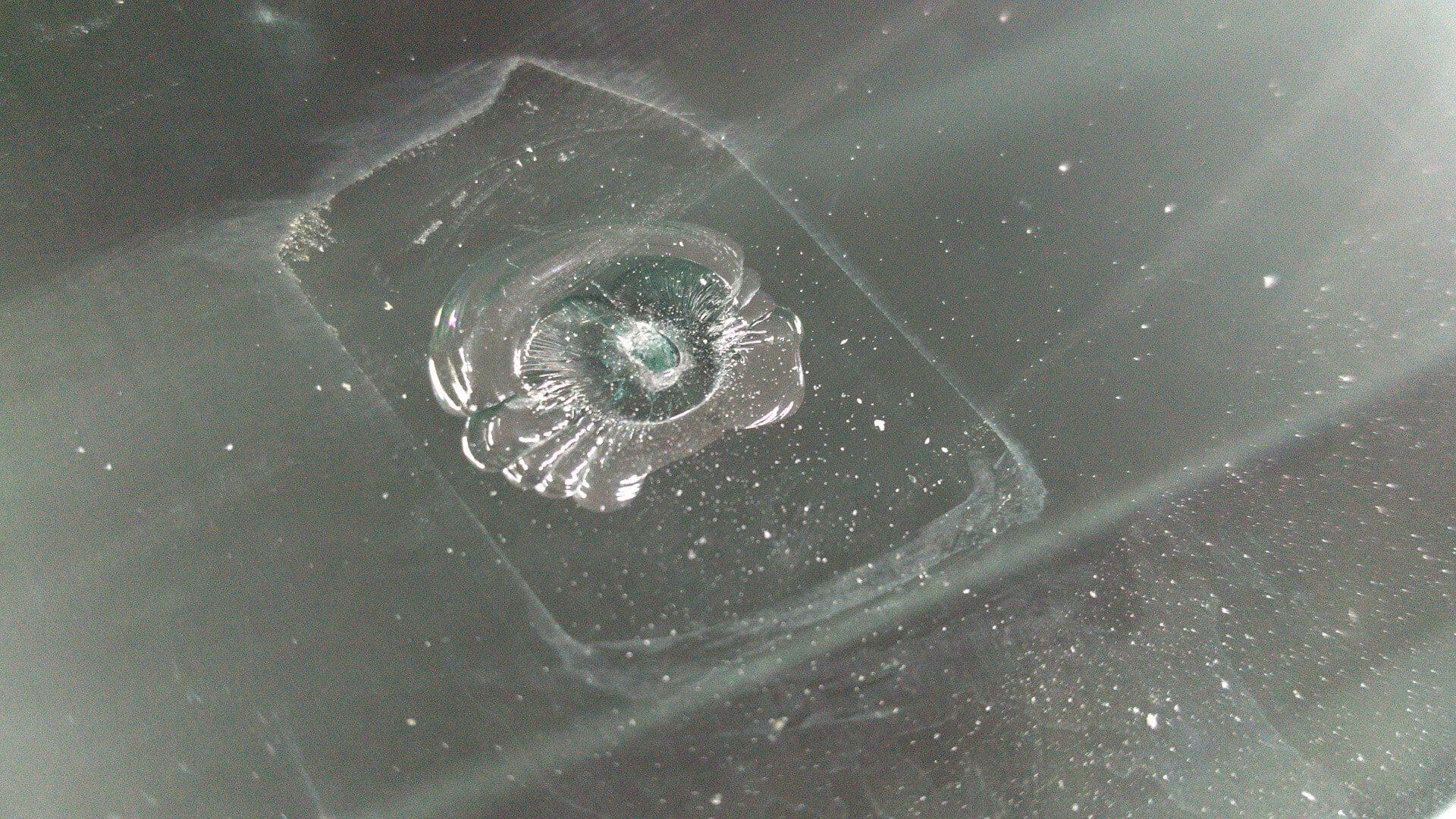 - Падение крупных предметов. Например, лед с крыши, шипы с грузовика — точечный удар высокой энергии. Могут появиться сколы или даже сквозная дыра с множественными трещинами.