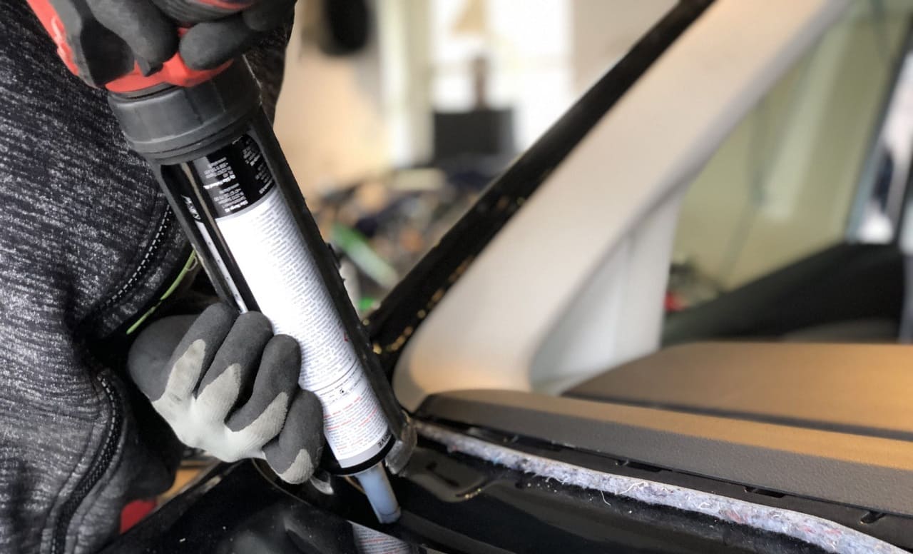 Нанесение герметика тоже имеет свои секреты. Состав должен ложиться непрерывной полосой определенного сечения – без разрывов, но и без излишков, которые вылезут внутрь салона или наружу. Наши мастера используют для этого специальные форсунки на пистолете. Малейшая деформация или износ приведут к дребезжанию на кочках и постоянным сквознякам.