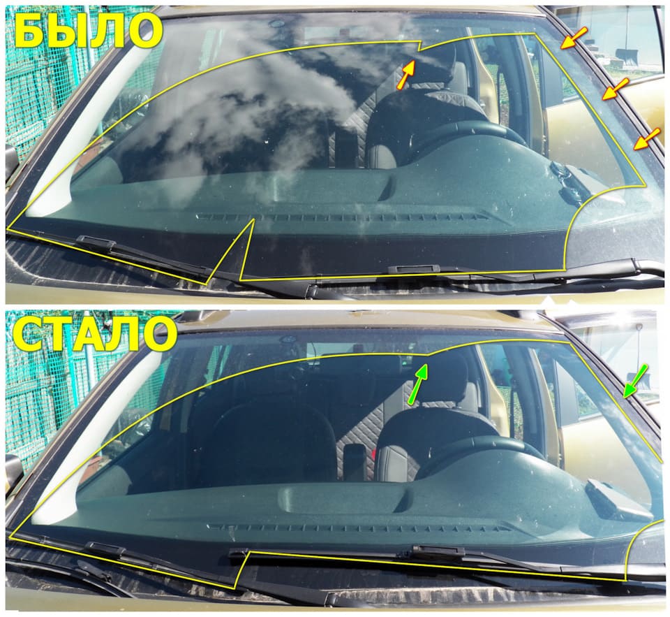 Скрип дворников при работе свидетельствует о затвердении резины или неправильном угле установки. Трещины эластичной кромки глубиной более 0,5 мм уже не устраняются полировкой. Отслоение каучукового элемента от каркаса — главное показание к замене. Наши мастера обращают внимание на полосы после работы стеклоочистителей. Если они остаются после чистки поверхности и щеток, требуется замена комплекта. Если это не сделать вовремя, то потребуется полировка или даже замена. Установим новое стекло в центре или с выездом к клиенту.