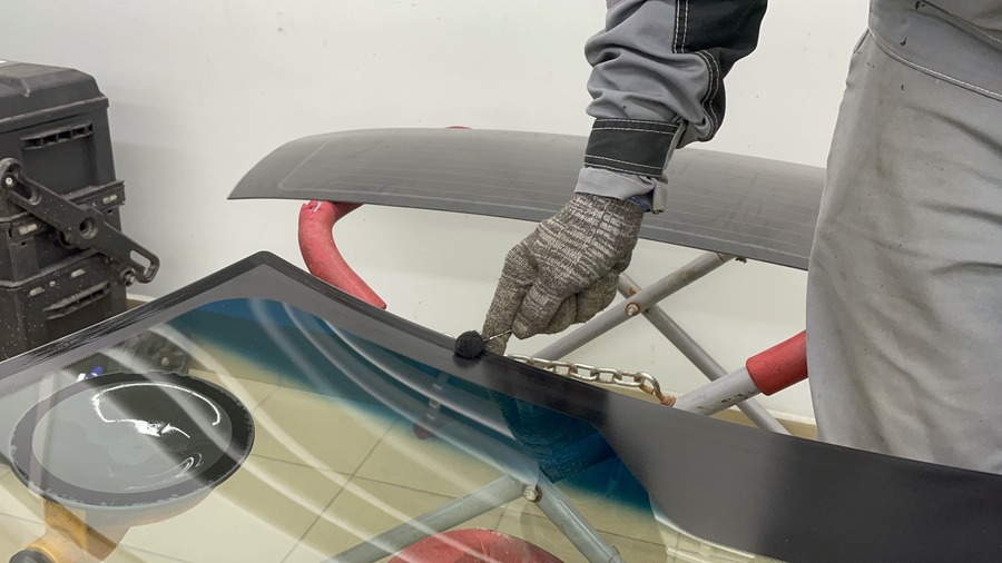 Пока праймер высыхает, эксперт по монтажу как раз успевает подготовить полиуретановый герметик, заправив его в пистолет. Этот этап точно вписывается в технологический процесс. Параллельно решаются и другие задачи, например, окончательно очищается и обезжиривается рабочая зона на стекле, куда будет нанесен клей. Сколько нужно герметика для вклейки лобового стекла, также решается на этой стадии – нужный объем зависит от ширины и глубины шва и строго регламентирован производителем системы.